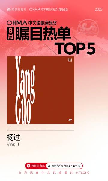 先说说让我心心念念的「2025中文说唱音乐奖」8月盘点。Vinz-T徐赢的《杨过》确实惊艳,连续五周在榜不说,还冲到了月度TOP3。这首歌巧妙地将金庸武侠元素融入现代说唱,既有江湖气息又不失潮流感,难怪能在海外华人圈引发热议。