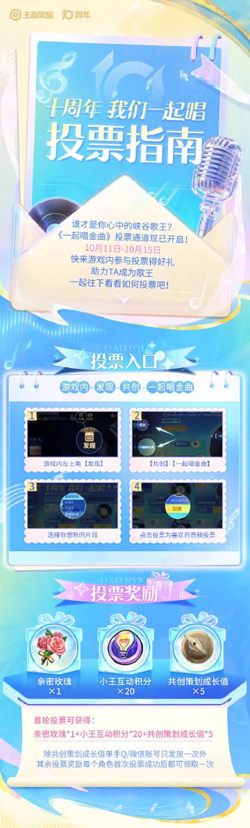 🔥这次《我们一起唱》峡谷金曲玩家合唱活动正在火热投票中。从10月11日到15日,玩家可以为自己喜欢的「峡谷歌王」投票助威。首投就能获得亲密玫瑰、小王互动积分等奖励,参与度直接拉满。