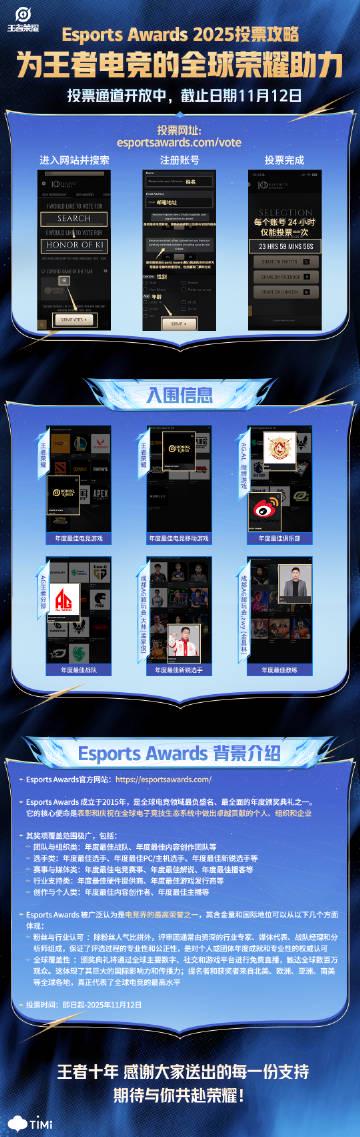 就在上周,被誉为「电竞界奥斯卡」的Esports Awards公布了2025年度提名名单。让人惊喜的是,王者荣耀同时入围了【年度最佳电竞游戏】和【年度最佳移动电竞游戏】两项大奖。这是中国手游首次在这项全球顶级赛事中获得双提名,堪称历史性突破。