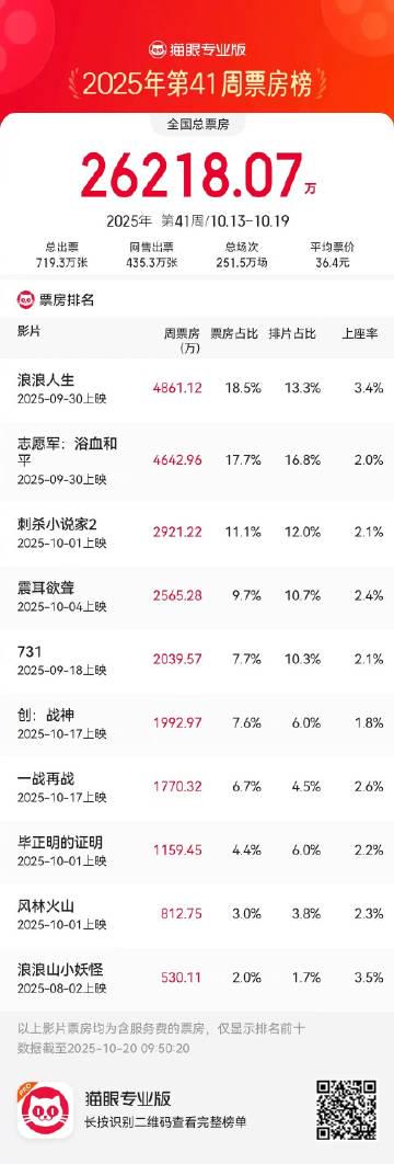 除了《浪浪人生》,这周票房榜也很有看点。《志愿军浴血和平》紧追其后,拿下4642万排在第二,这种主旋律大片在国内一直很吃香。《刺杀小说家2》和《震耳欲聋》分别位列三四名,类型各异,满足了不同观众的口味。