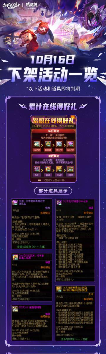 在版本更新维护之后,部分活动将会下架,其中包含了许多珍贵的奖励道具,比如终末令牌、史诗融合石袖珍罐以及+10增幅券等。这些道具都有使用期限,请大家务必留意时间,及时清理和使用,避免造成不必要的损失。