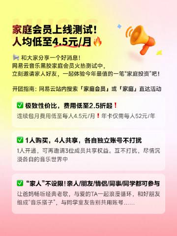 直到前天刷朋友圈,看到表妹晒了张截图——『网易云黑胶家庭会员测试中,人均4.5元/月』。我盯着那个价格算了三遍,立刻在家庭群里@了所有人:『这波羊毛必须薅!』